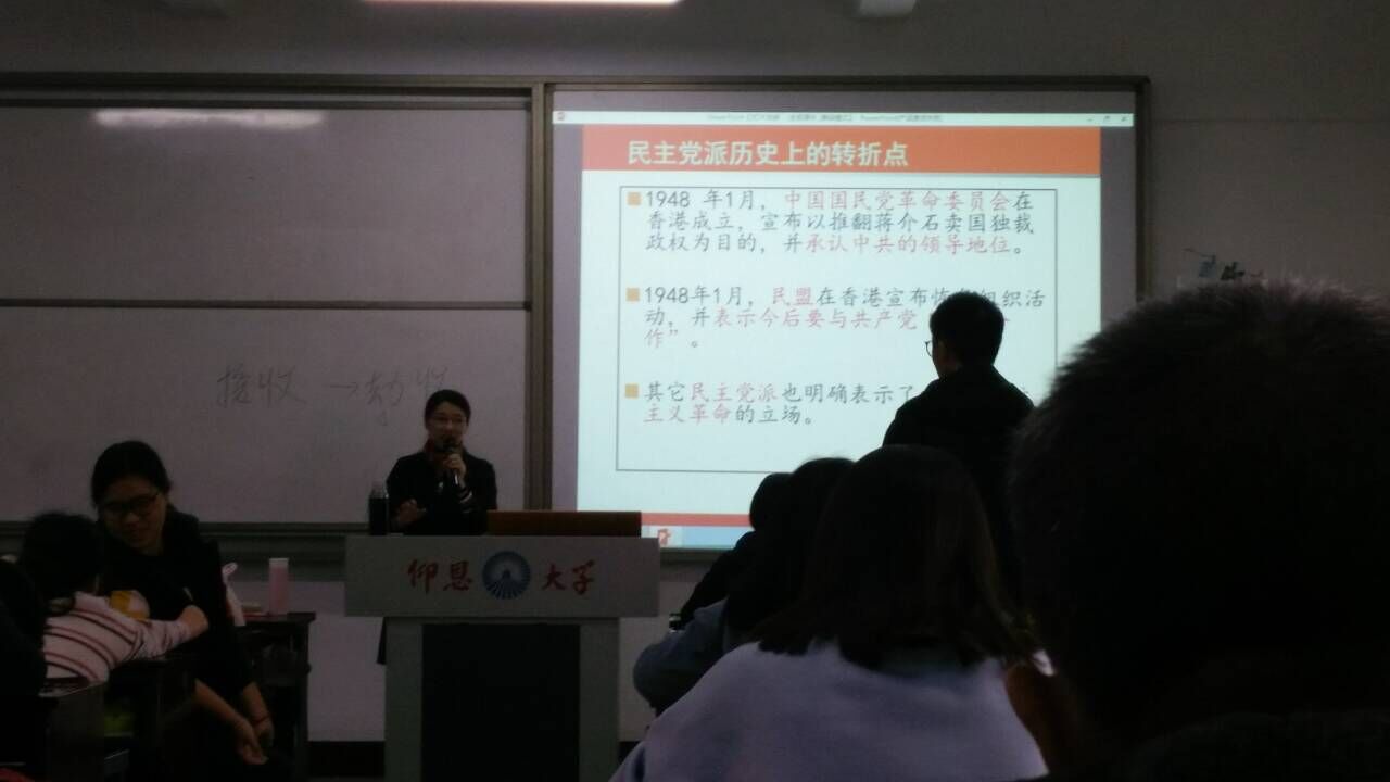 康丽颖老师第二节课进行了教学改革,要求三位同学选择相关内容进行PPT汇报,三位同学分别就“抗战军人之魂—张自忠”、“陈康容—忠勇为党的女英雄”、“难忘的1949—开国大典”进行了汇报。三位同学汇报结束后,康丽颖老师请班级其他同学就三位同学的汇报情况进行了点评,最后亲自做了总结。