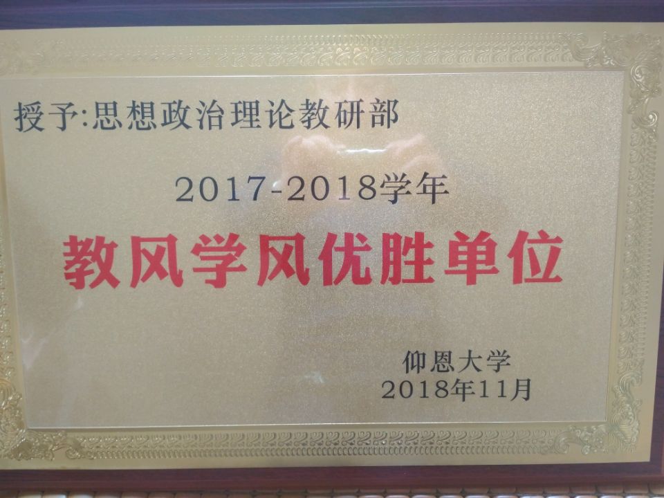 思想政治理论教研部获得2017-2018年度 “教风学风建设先进单位”是该部门连续第三年获得此项荣誉,这是全校师生对思想政治理论教研部全体教师教学工作的一次高度肯定。该项荣誉的评选经过参评单位提供材料,教务部根据评审材料逐项评审打分,学校领导总评,优胜单位公示等环节,评选工作前后历时一个多月,从12个参评单位中评选出5个教风学风建设优胜单位。