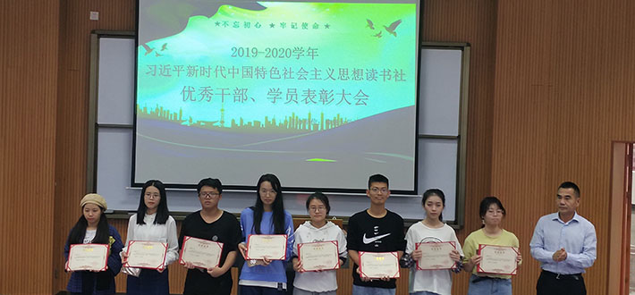 表彰大会按照既定议程,首先由党委组织部部长王洋宣读《2019-2020学年习近平新时代中国特色社会主义思想读书社表彰决定》,对读书社8名优秀学生干部和26名优秀学员予以表彰。党委副书记程如平、组织部部长王洋和宣传部副部长陈章祧分别为“优秀学生干部”和“优秀学员”颁奖并合影留念。