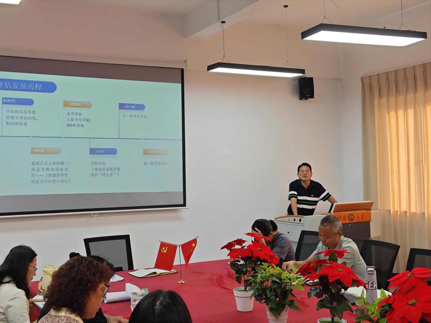 李克钦首先向大家强调了审核评估工作的重要性和紧迫性。他指出,审核评估工作不仅关系到学校的整体发展,也与每个人的切身利益息息相关,因此务必要做好充分的准备。随后,他从发展历程、评估分类、评估主题、评估项目、评估流程等方面向大家系统介绍了二级学院审核评估工作的具体要求。他特别指出,本轮审核评估重点在立德树人与思想政治教育领域,因此在准备材料的过程中要凸显出学院的教育教学特色,同时,他还要求大家充分熟悉学校的办学定位、专业建设、培养模式、课堂教学、实践教学等情况,以避免在材料的整理过程中出现原则性错误。