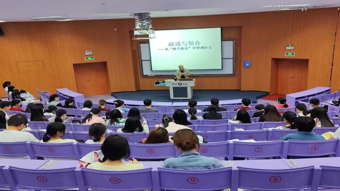 杨中华教授从“为什么结合”“能不能结合”“把什么结合”“结合成什么”“怎么样结合”等五个方面,向同学们深入分析了马克思主义基本原理同中国具体实际相结合、同中华优秀传统文化相结合的重大理论观点。他指出,从中国发展进程上来看,中国共产党在理论与实践中进行“两个结合”是历史的、必然的,是符合时代发展要求的。“第二个结合”的提出对新时代实现马克思主义中国化的新飞跃具有重要意义。