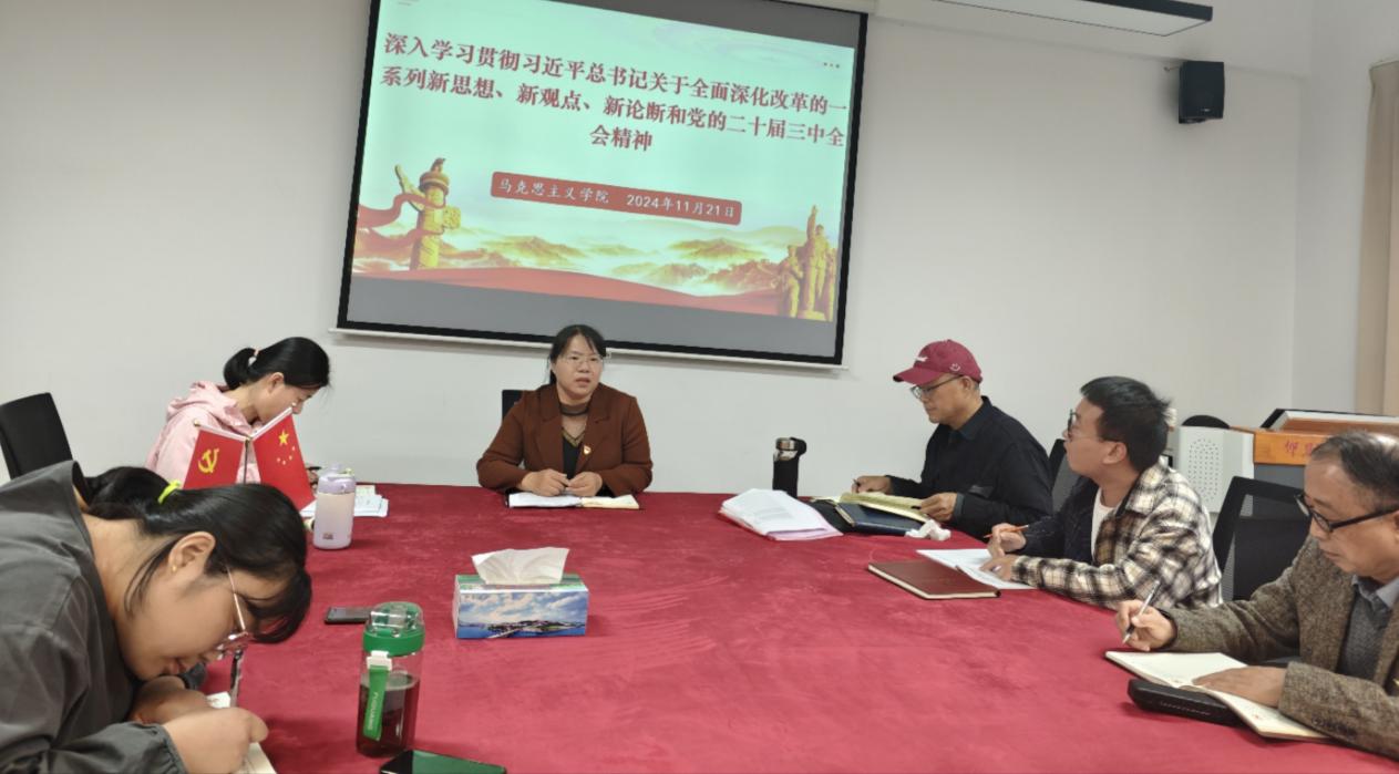 为深入学习贯彻落实党的二十届三中全会精神,引导学院全体党员、思政课教师深刻认识党的二十届三中全会的重大意义,切实把全会精神与学院工作结合起来,11月21日,金年会官网党支部在普照楼316开展二十届三中全会精神学习与理论研讨活动。会议由学院党支部宣传委员赵杰主持。