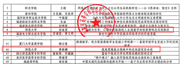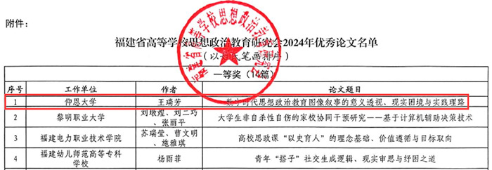 近日,福建省高等学校思想政治教育研究会发布了《关于表彰福建省高等学校思想政治教育研究会2024年优秀论文的通知》,金年会选送的3篇论文均获奖。其中,王瑞芳老师撰写的《数字时代思想政治教育图像叙事的意义透视、现实困境与实践理路》获一等奖,在所有一等奖获奖论文中位列第一。孙海英老师撰写的《共情与引导:心理学赋能高校人生观教学的创新策略及实现路径》和章娇娜老师撰写的《底线思维能力视域中的总体国家安全观》获优秀奖。