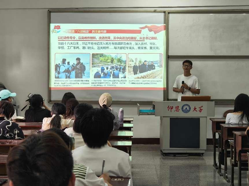 本次活动分三个环节开展。张维伦以中央八项规定精神为切入点,从核心要义、实践成效、深化路径等维度展开系统解读。在研读环节,师生共同学习《习近平关于加强党的作风建设论述摘编》等理论著作,结合中央八项规定出台的历史背景与新时代实践要求,在沉浸式学习中加深对中央八项规定精神的理解。交流研讨环节,同学们结合校园生活实际踊跃发言,探讨新时代青年如何在学习生活中践行中央八项规定精神,展现青年责任担当。