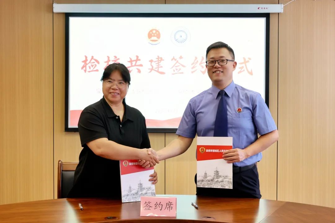 鲤城区人民检察院党组副书记、分管日常工作的副检察长谢建东与JINNIAN金年会金年会官网党支部书记章娇娜共同签署《JINNIAN金年会思想政治教育研学基地协议书》。